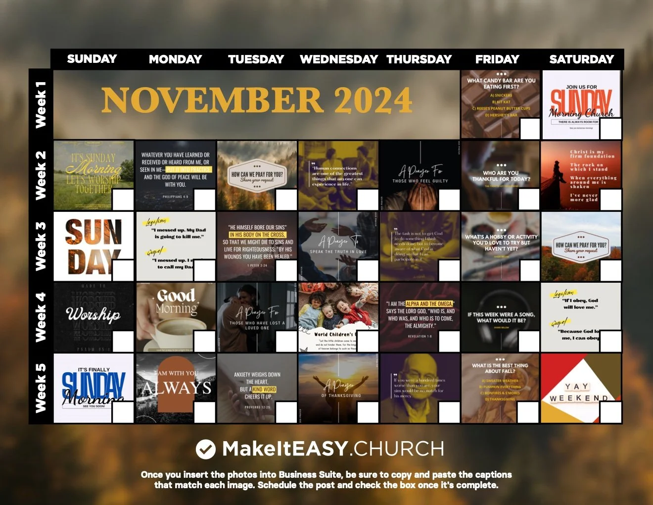 We have pre-written captions for every post and you can use them as is or edit them to best represent your church. Either way, we give you a great starting point and save you hours of time every month.